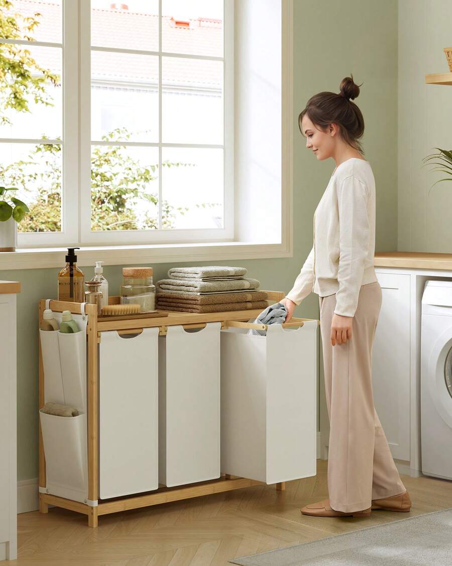 Laundry Basket With 3 Compartments, Laundry Hamper, Holds Up To 150 L, Laundry Sorter, With Shelf, Laundry Bag, Side Pockets, 3 X 50 L, 94 X 33 X 78 Cm, Cream White Grey