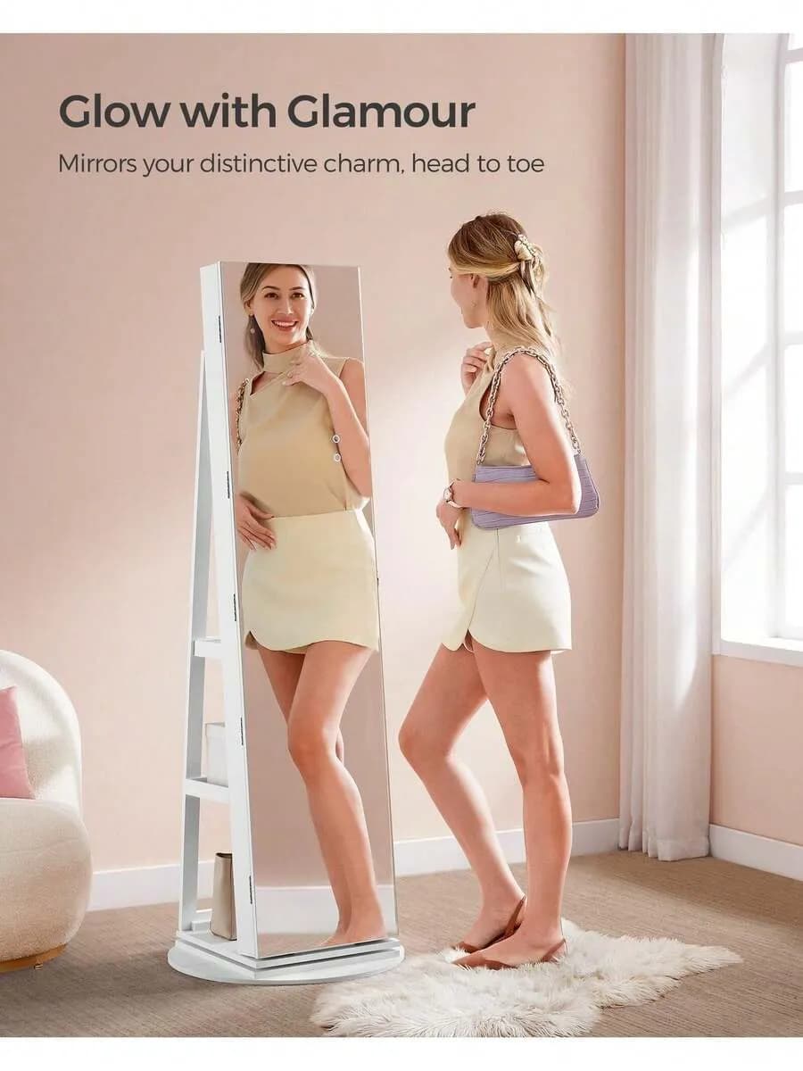 6 LEDs Mirror Jewellery Cabinet, 360 ° Swivel Jewellery Storage Organiser, Lockable, Free-Standing Frameless Full-Length Mirror With Storage Valentine's Day, White Surface, Black Lining Back To School Dormitory Storage