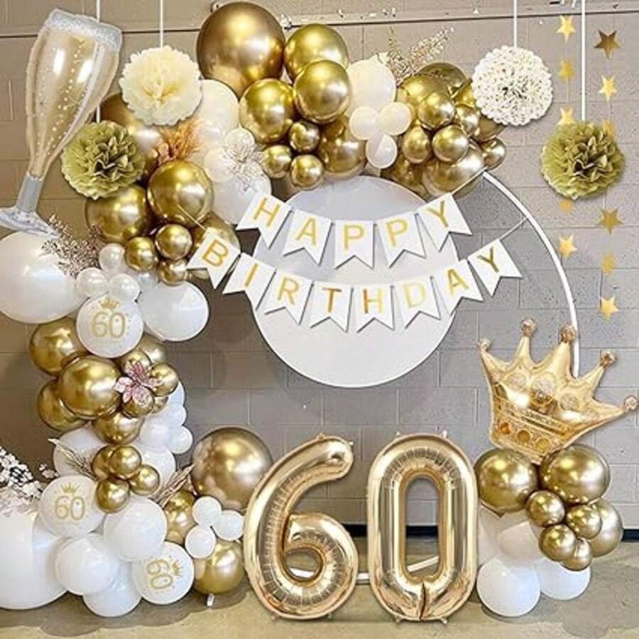 60th Birthday Decorations, Gold 60th Birthday Decorations For Men Women Gold White Balloons HAPPY BIRTHDAY Banner Number 60 Balloons Crown Star Heart Balloons HAPPY 60th BIRTHDAY Cake Topper