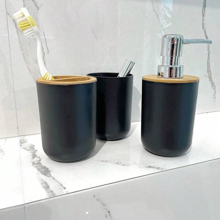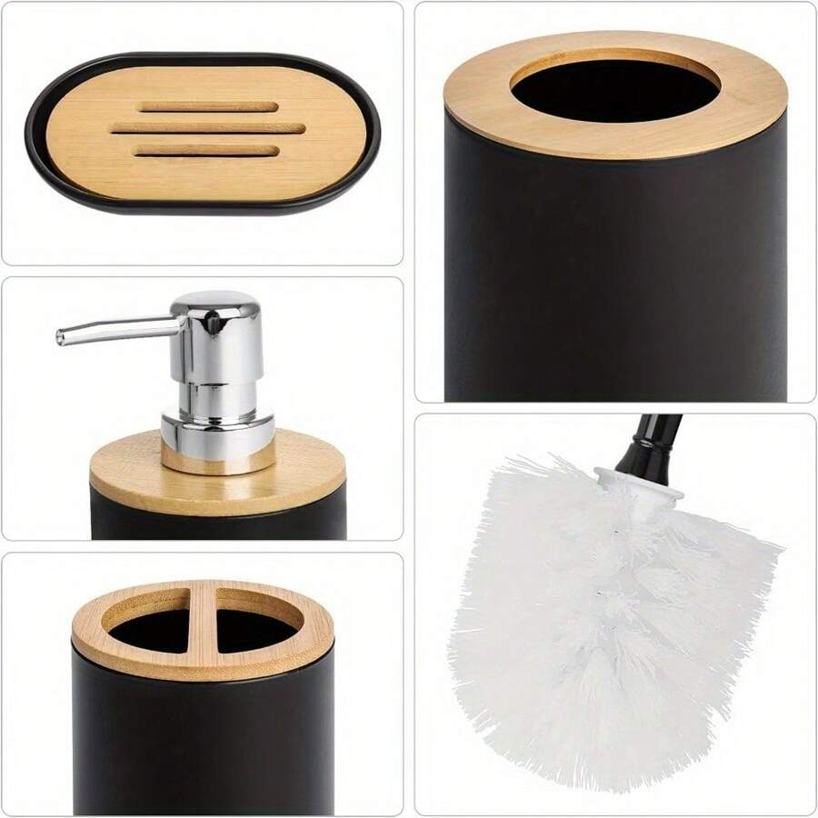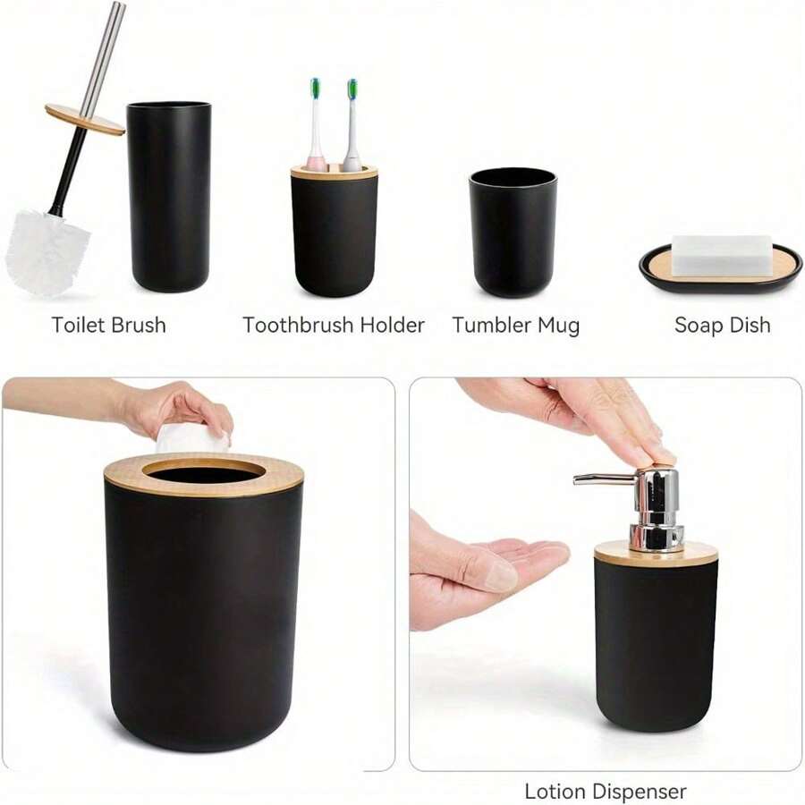 6 Pieces Bathroom Accessories- Bathroom Bin And Toilet Brush Set- Durable Toothbrush Holder Cup- Soap Dispenser With Pump- Soap Dish Holder- Modern Trash Can (Black)