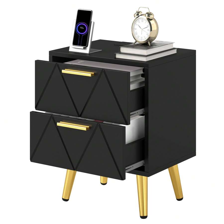 Bedside Table With 2 Drawers & Power Station, Modern Nightstand End Table With Metal Legs And Handles, 40x30x52cm