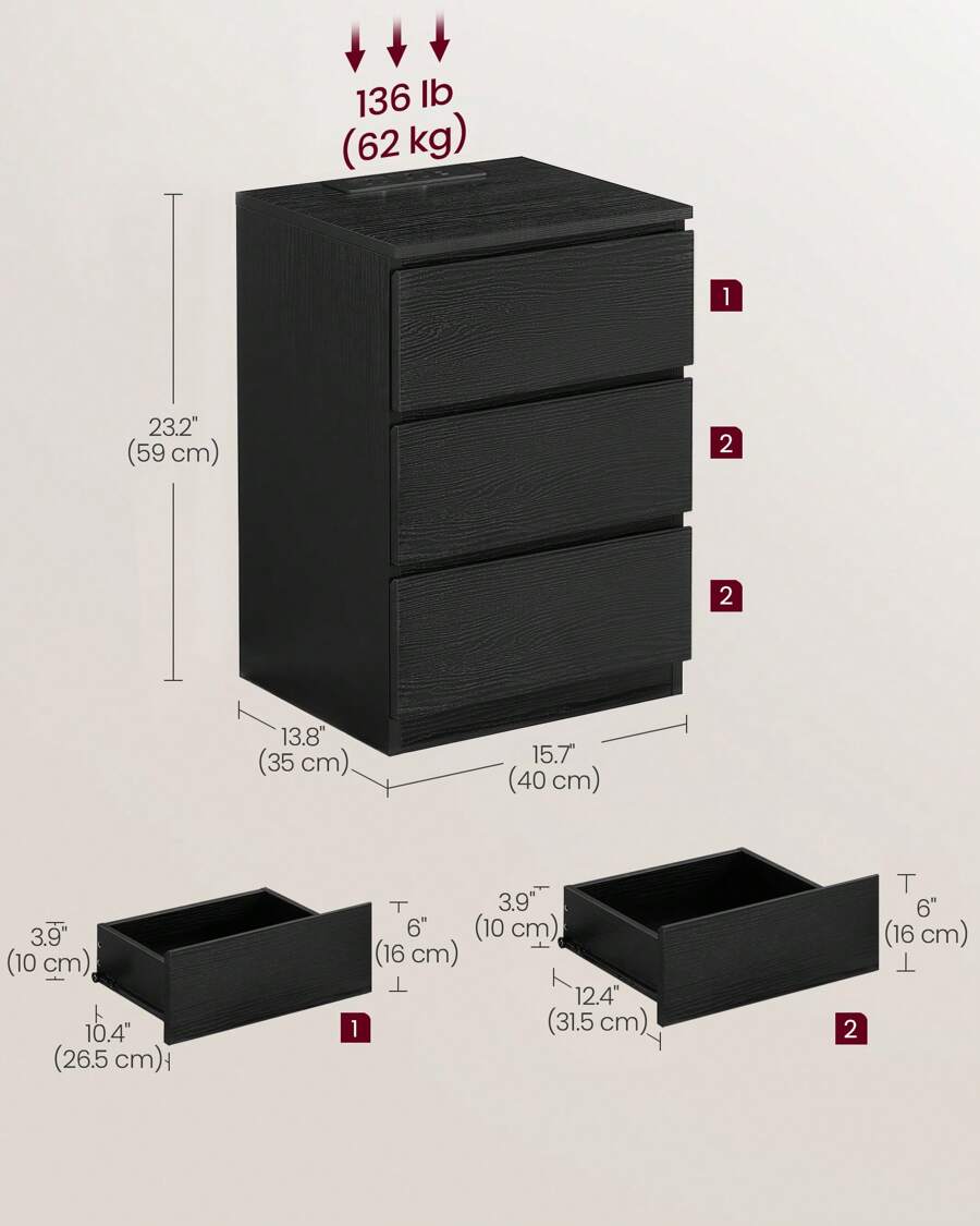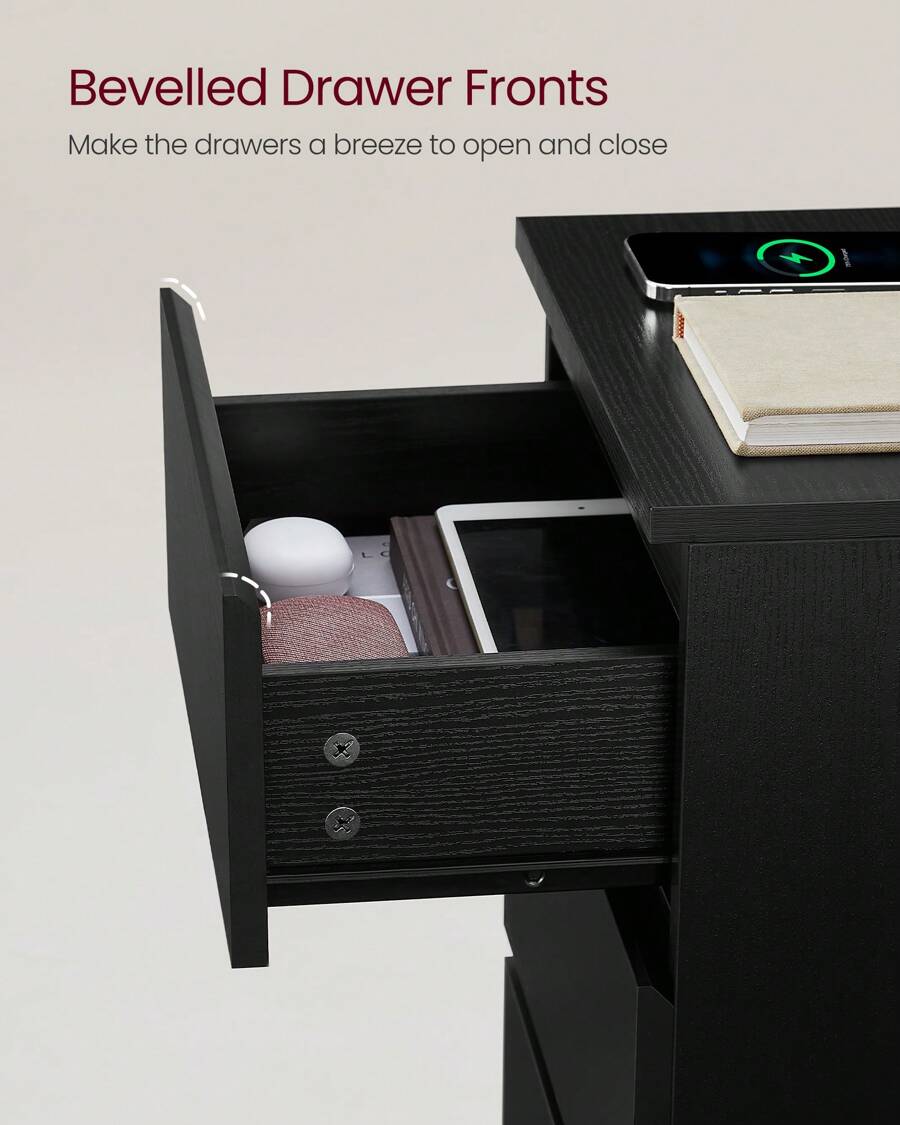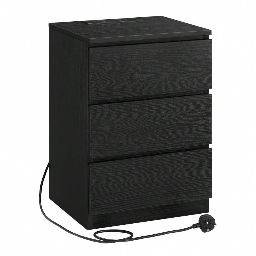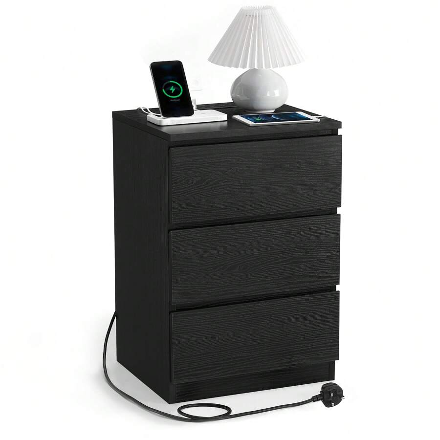 Bedside Table With Charging Station, Side End Table With 3 Drawers, 2 AC Outlets, 2 USB Ports, Bevelled Drawer Fronts, For Living Room, Bedroom, Study, Modern