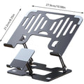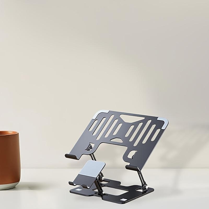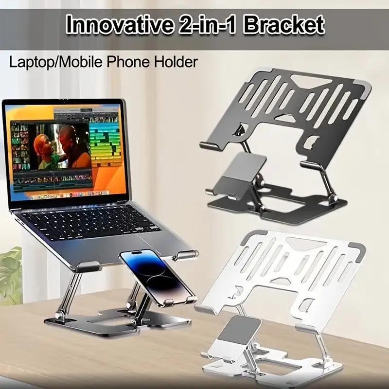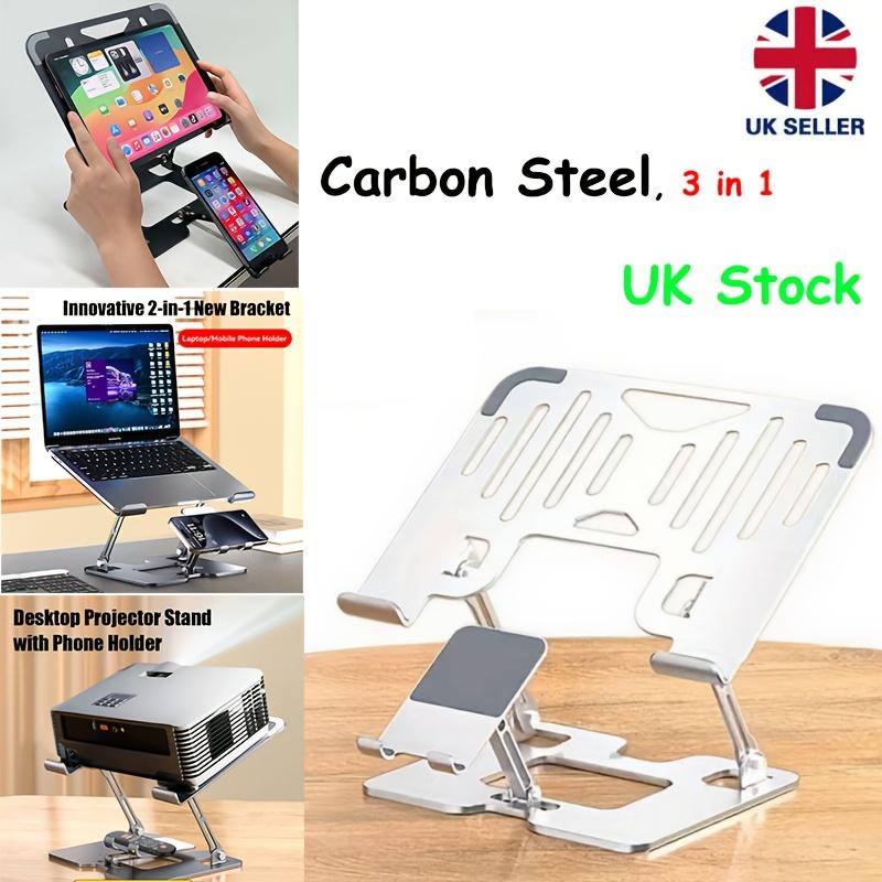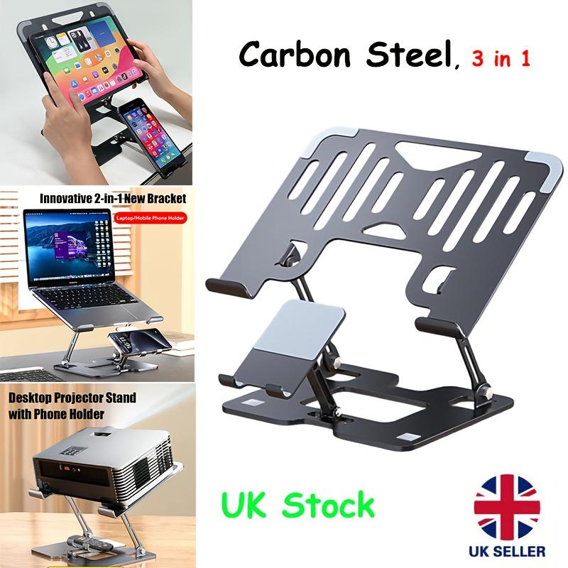 3 in 1 for Laptop, Phone, TabletSuperior Stability with All-Metal Carbon Steel BuildCrafted entirely from high-grade carbon steel, this laptop stand offers exceptional stability to support laptops, tablets, and smartphones of various sizes without wobbling. The robust metal construction ensures long-lasting durability, capable of withstanding daily use and heavy loads, making it a reliable choice for both home and office setups. Designed to accommodate laptops (up to 16 inches), tablets, and smartphones, this stand eliminates the need for multiple holders. Whether you’re working on a laptop, streaming on a tablet, or taking video calls on your phone, it provides a secure and convenient platform, keeping your workspace organized. Efficient Ventilated Cooling SystemThe stand features a hollowed-out, grid-like structure that promotes optimal airflow around your laptop, preventing overheating during extended use. This is especially beneficial for gamers, designers, or anyone using resource-intensive applications, ensuring your device runs smoothly at all times. Rotatable Adjustable for Custom ComfortWith a 360 ° rotatable base and multiple height-adjustable settings, you can easily find the perfect viewing and typing angle. This flexibility helps reduce neck, shoulder, and eye strain, making it ideal for long work or study sessions. Whether sitting or standing, you can tailor the stand to your ergonomic needs. Sleek Dual-Color Design for Any SpaceAvailable in both black and white, this stand complements any desk setup, from modern home offices to minimalist workspaces. Its compact and stylish design not only saves space but also adds a touch of sophistication to your environment. Non-slip rubber pads on the base and device tray further enhance stability, preventing slips and scratches.