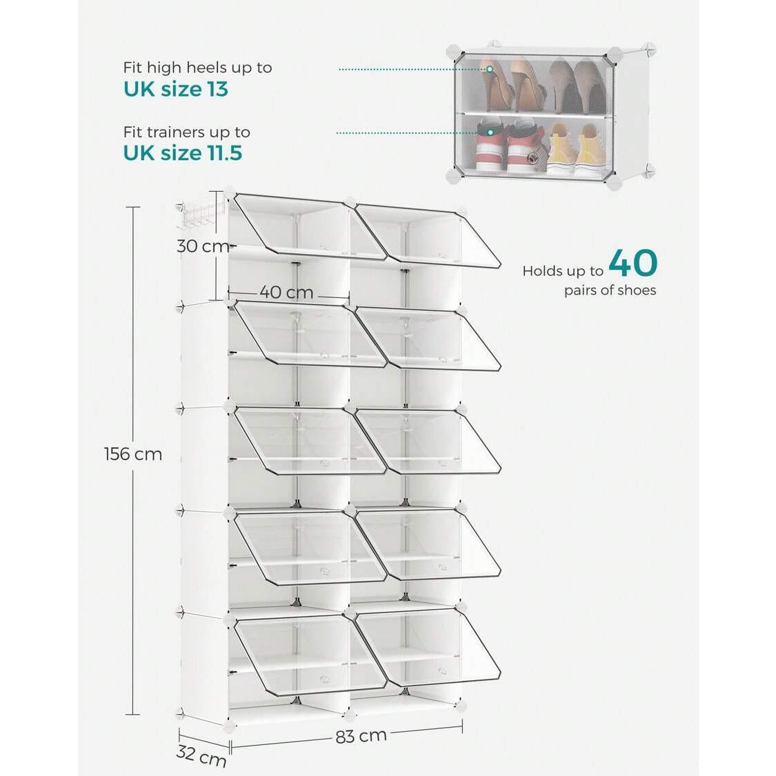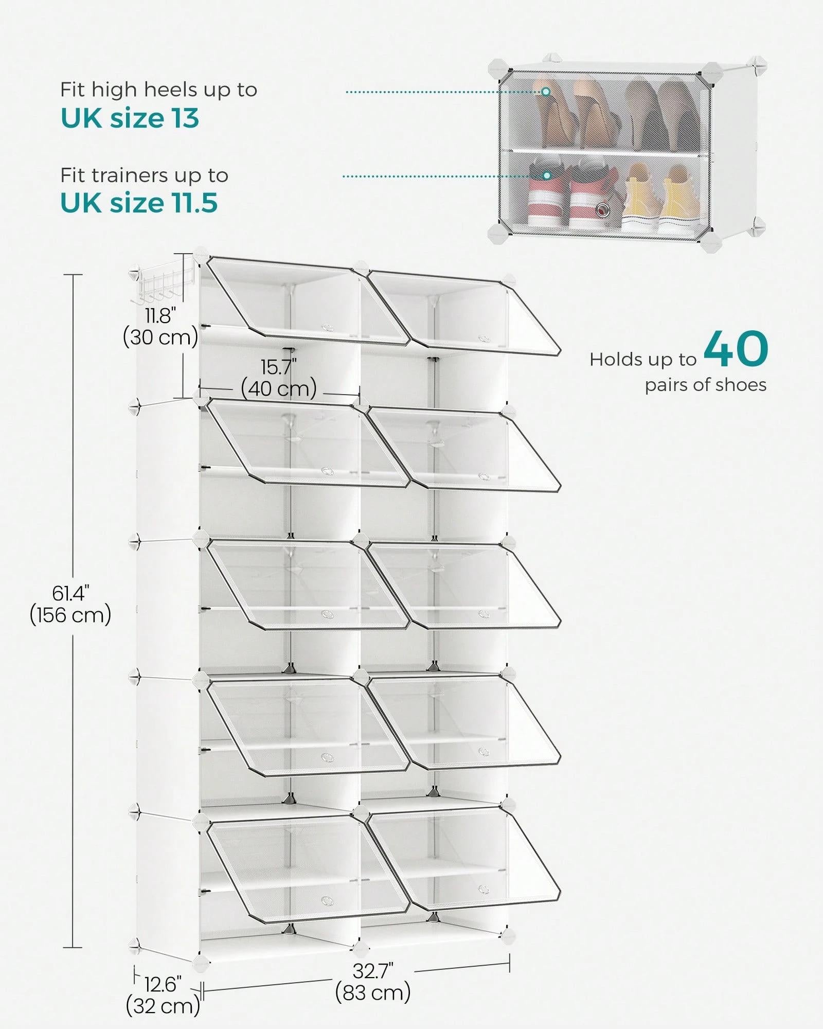 [Plenty of Space] This plastic shoe storage organiser, capable of holding up to 40 pairs of shoes, can also be used to store bags and clothing.With its space-saving side hooks, it's a convenient way to hang hats or dog leashes