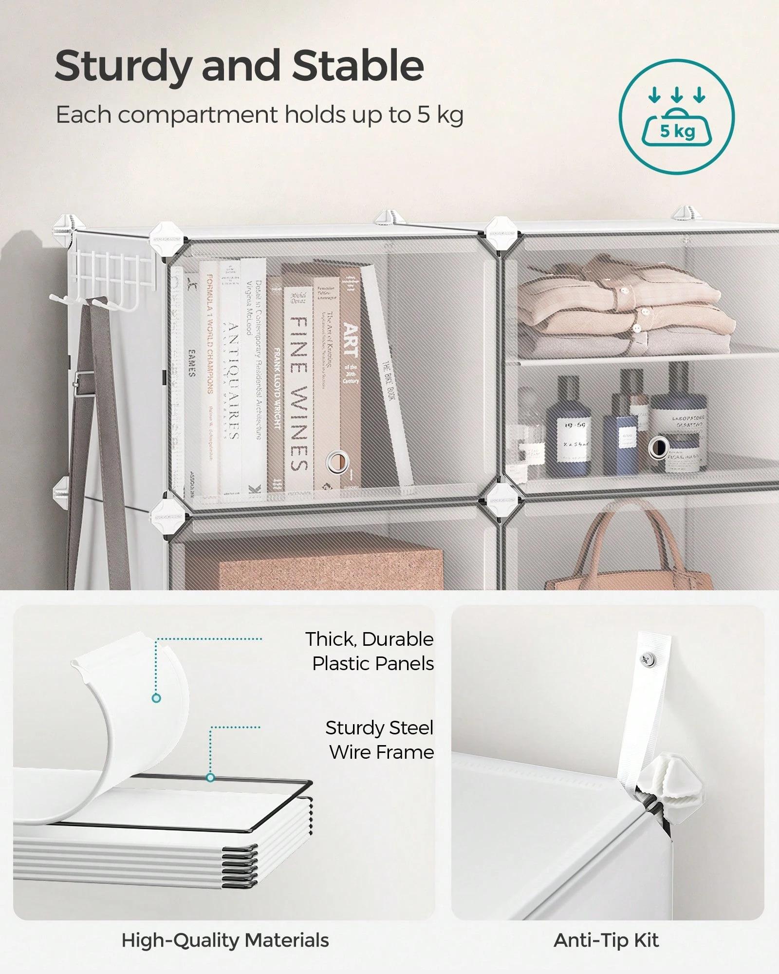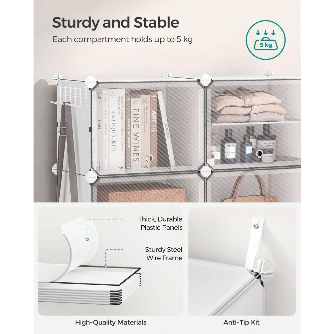 [Sturdy and Safe] Made with high-quality connectors, plastic panels, and robust steel wire, each compartment of this shoe cabinet supports up to 5 kg.The included anti-tip kit enhances safety for use in living rooms or bedrooms