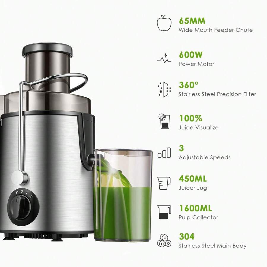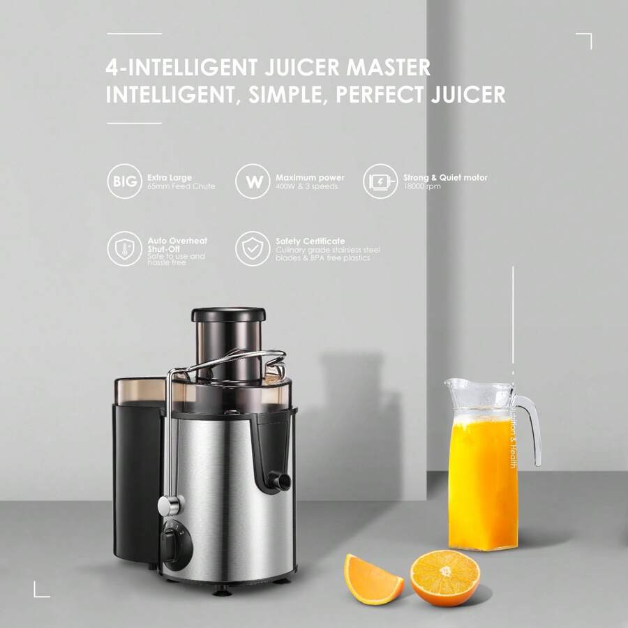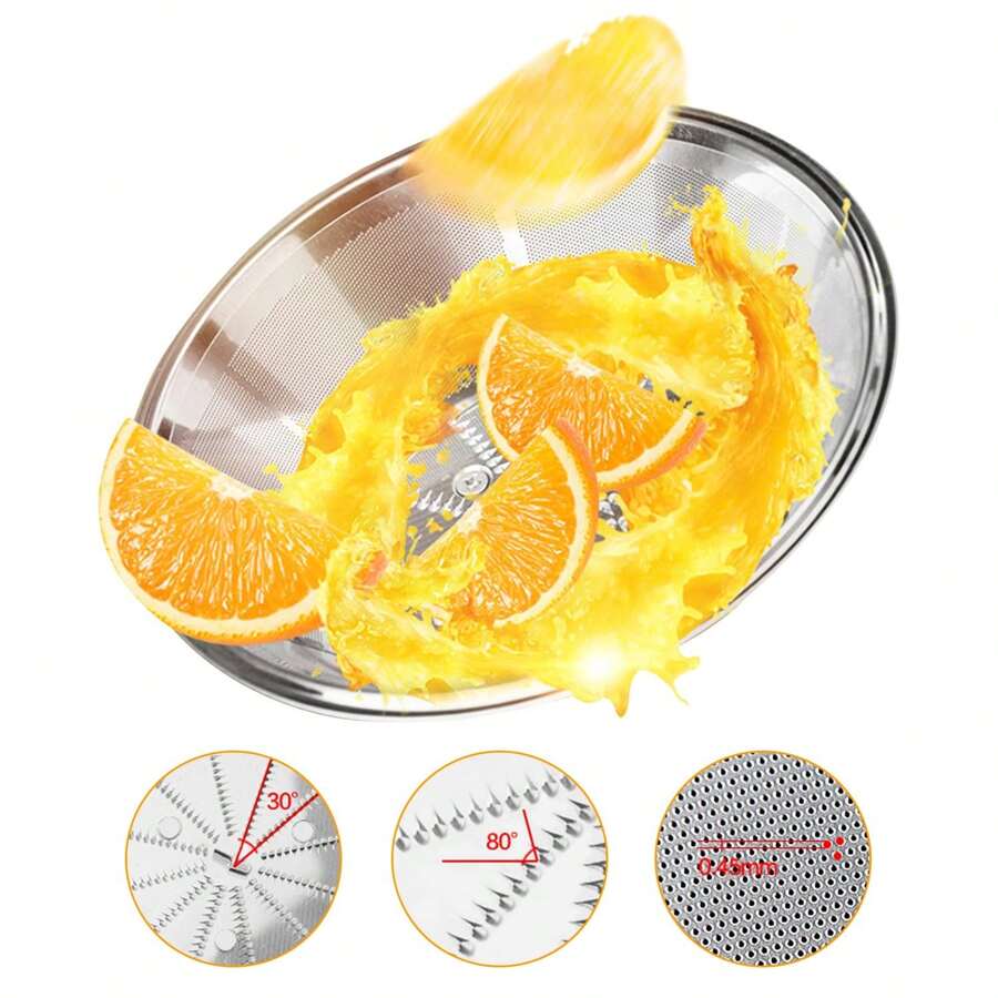 MORE JUICE & EFFICIENCY---Featuring a precision stainless steel cutting disc surrounded by a special micro-mesh filter, it extracts 30% more juice and 35% more vitamins and minerals than other juicers.The upgraded 400W motor is more stable and efficient.
