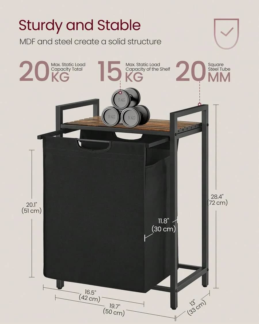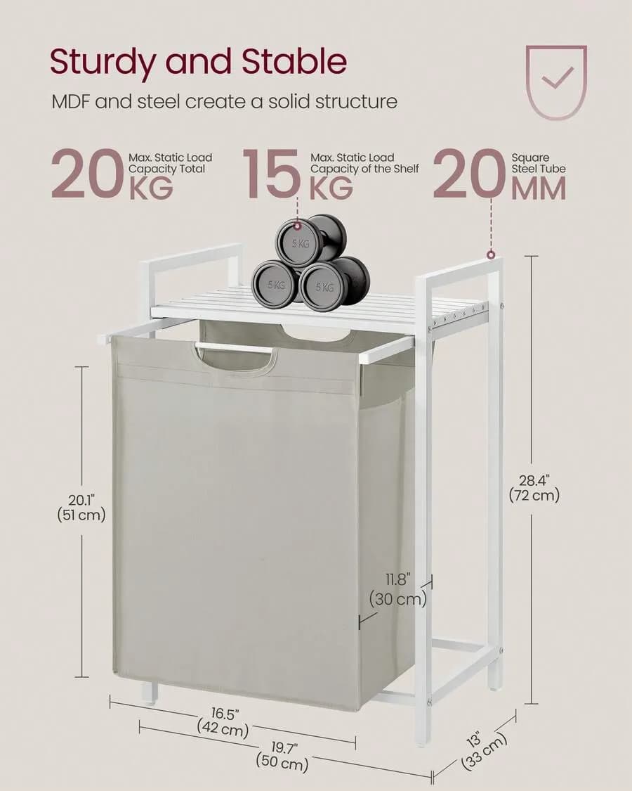 [Sturdy & Stable] Crafted with a 2 cm steel tube frame and MDF panel, this laundry basket supports up to 20 kg on its top shelf.In addition, the liner is made of water-repellent Oxford fabric, and the four adjustable feet provide stability