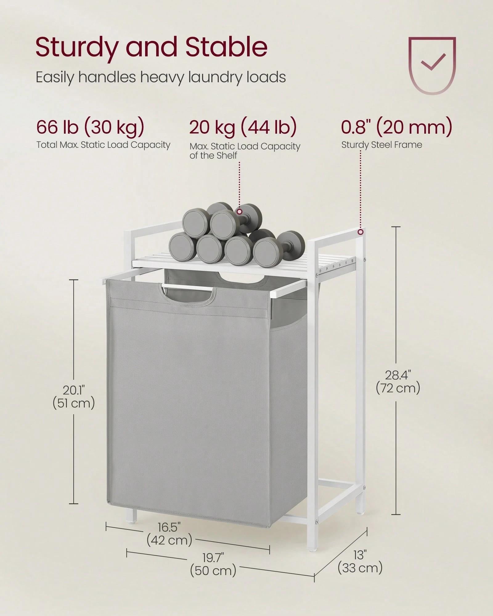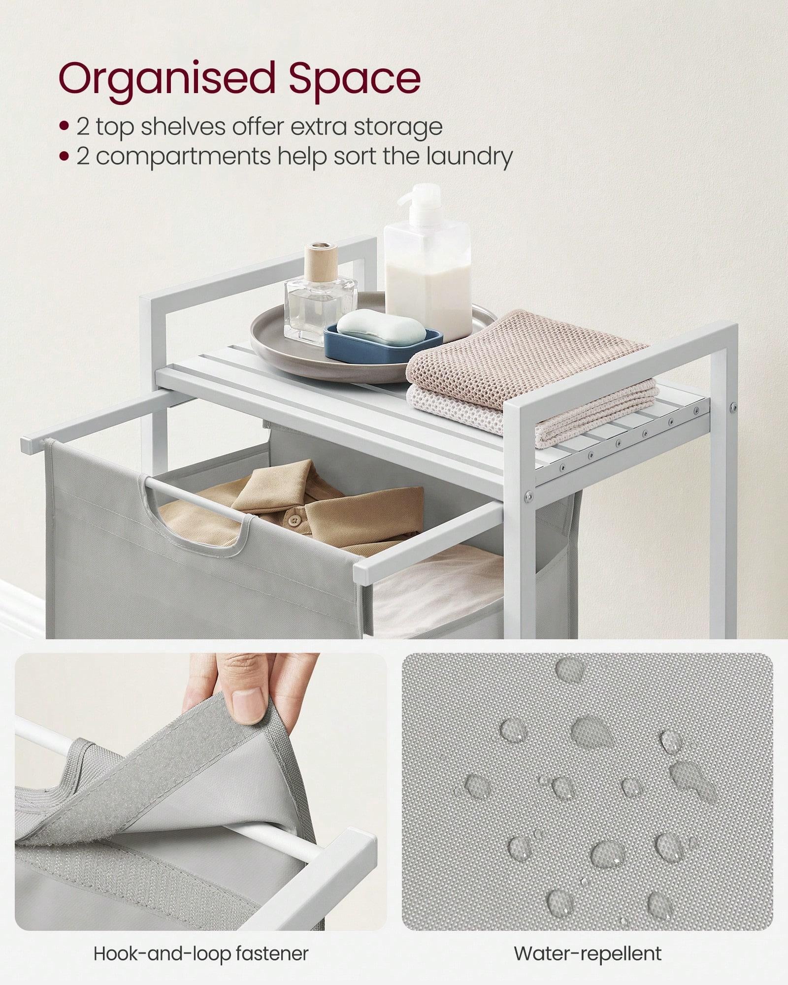 [Sturdy & Stable] Crafted with a 2 cm steel tube frame and MDF panel, this laundry basket supports up to 20 kg on its top shelf.In addition, the liner is made of water-repellent Oxford fabric, and the four adjustable feet provide stability