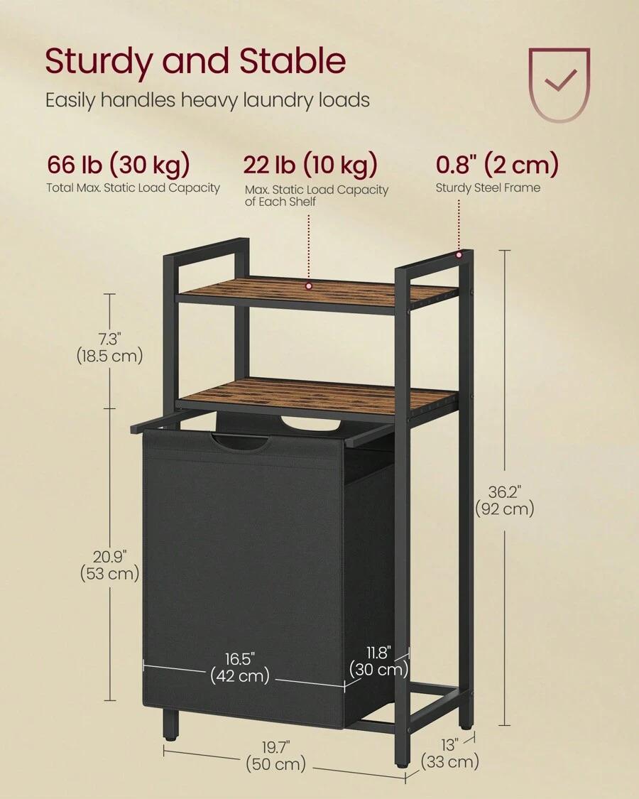 [Sturdy & Stable] Crafted with a 2 cm steel tube frame and MDF panel, this laundry basket supports up to 10 kg on each top shelf.In addition, the liner is made of water-repellent Oxford fabric, and 4 adjustable feet provide stability